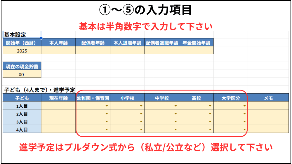 - 開始年、家族の年齢、退職予定年齢、年金開始年齢