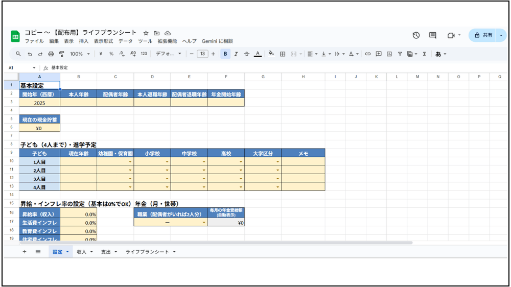 配布するシートでは、教育費や退職・年金の開始年なども同じシート内で連動します。