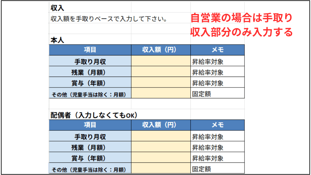 - 昇給していく収入と、固定で変わらない収入を分けて入力します