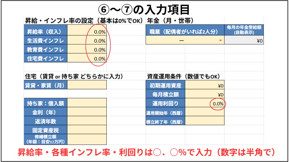 ※配偶者情報を入力している方は、「会社員×会社員」のように併記されているものから選択。自分で年金額を指定したい場合は、直接毎月の年金受給額を入力する。 - 昇給率・インフレ率(必要な場合のみ。迷ったら0%でOK)