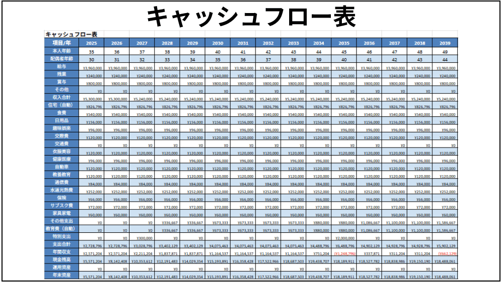 - キャッシュフロー表では、収入合計/支出合計/年間収支/年末資産が年ごとに表示されます。