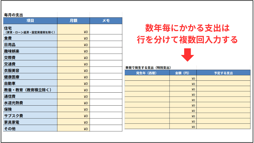 - 特別支出(旅行、車の買い替え、家電の更新など年単位で発生するもの)