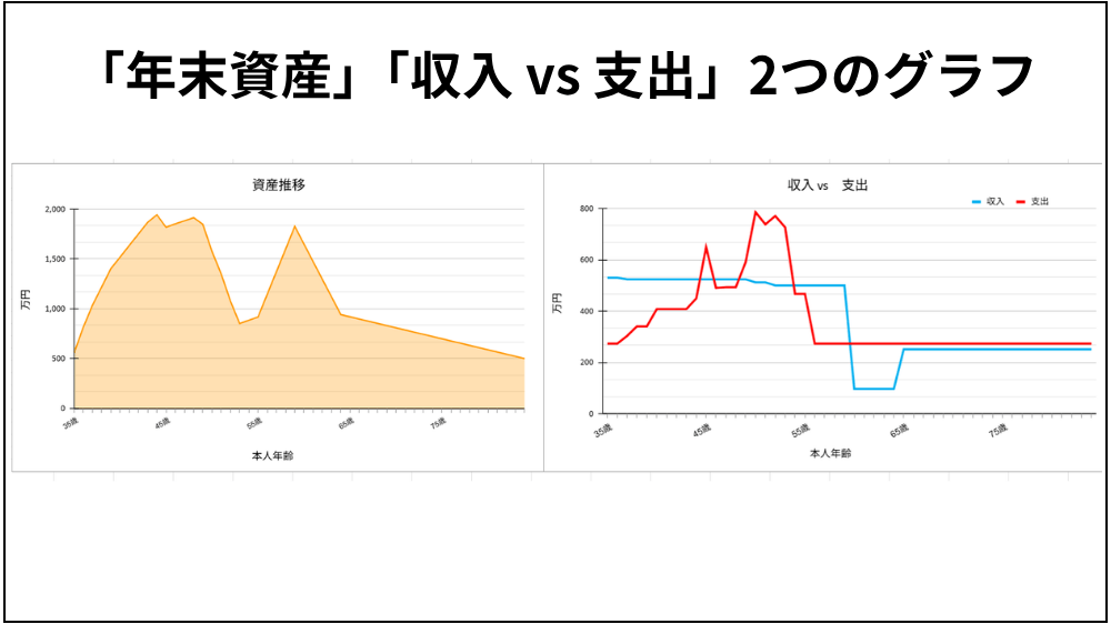 - 2つの表の下には、「年末資産」と「収入 vs 支出」の経過がグラフで見やすく表示されます!