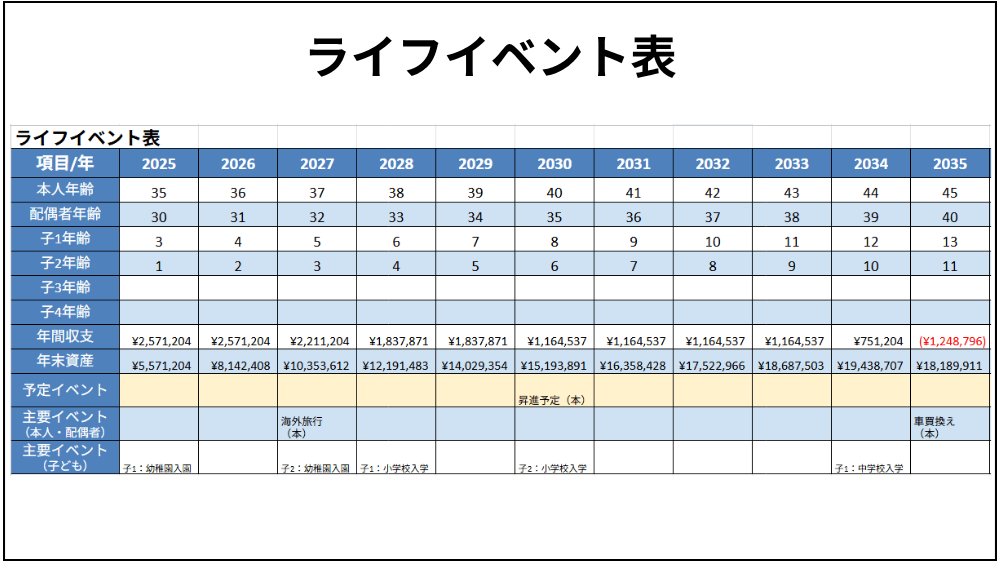 - 子ども・住宅・ライフイベントの一覧(入学/車買い替え等がいつ来るか)